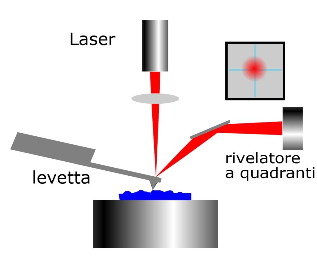 Il sensore di forza è una levetta (cantilever) molto sottile e flessibile alla cui estremità è realizzata una punta. Generalmente ha una forma rettangolare con lunghezza di circa 100 µm e larghezza 30 µm circa, il suo spessore è tipicamente inferiore ad 1 µm. Un sottile fascio di luce da un diodo laser colpisce il dorso della levetta e si riflette in direzione di un fotorivelatore a quadranti. Se la sonda viene avvicinata al campione la punta risente delle forze d’interazione con la superficie del campione da esaminare e la levetta si flette. Ogni minima deviazione del fascio riflesso, causata da una variazione d’inclinazione della levetta, è trasformata in un segnale elettrico proporzionale alla forza che in quel momento agisce sulla punta.